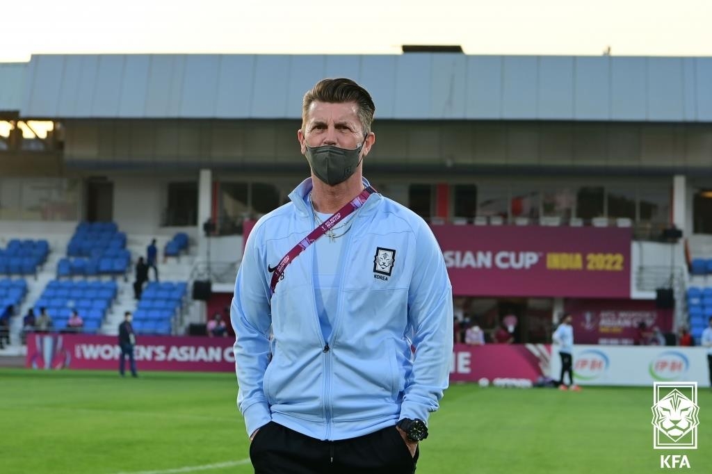 | ▲ South Korea head coach Colin Bell waits for the start of his team's Group C match against Vietnam at the Asian Football Confederation Women's Asian Cup at Shree Shiv Chhatrapati Sports Complex in Pune, India, on Jan. 21, 2022, in this photo provided by the Korea Football Association. (PHOTO NOT FOR SALE) (Yonhap) |