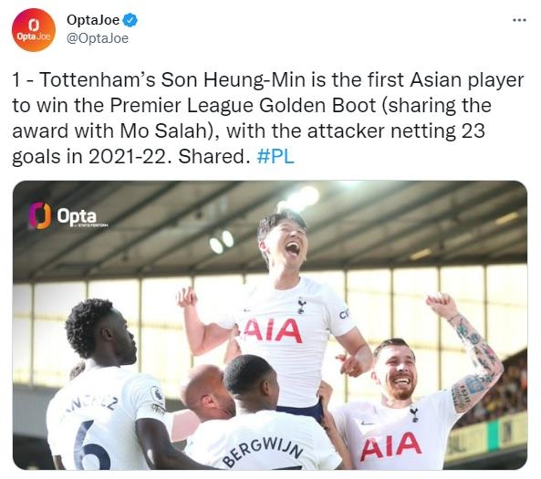 | ▲ 아시아 선수로는 처음으로 EPL 득점왕에 오른 손흥민 [옵타 트위터 캡처. 재판매 및 DB 금지] |