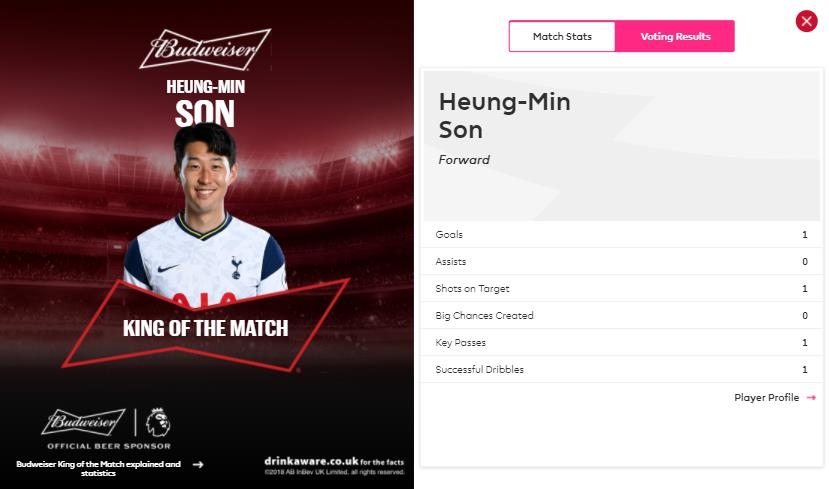 손흥민은 2만489명의 팬이 참여한 '킹 오브 더 매치' 투표에서 69.3%의 압도적인 지지를 받았다. 2위인 팀 동료 자펫 탕강가(15.7%)의 4배가 넘는 득표율이었다.