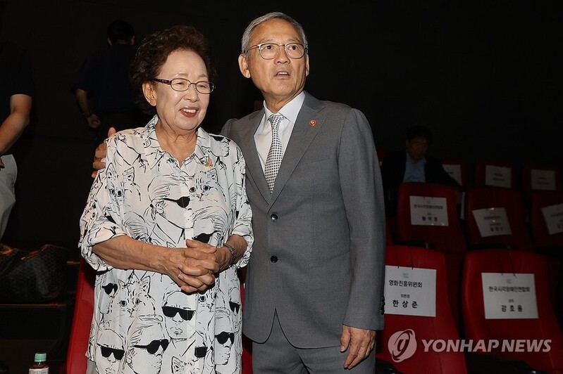 | ▲ 인사 나누는 유인촌 장관과 배우 나문희 (서울=연합뉴스) 류효림 기자 = 유인촌 문화체육관광부 장관(오른쪽)과 배우 나문희가 4일 서울 종로구 CGV 피카디리1958에서 열린 가치봄 영화제 영화'소풍' 상영회에서 인사를 나누고 있다. 2024.9.4 ryousanta@yna.co.kr |