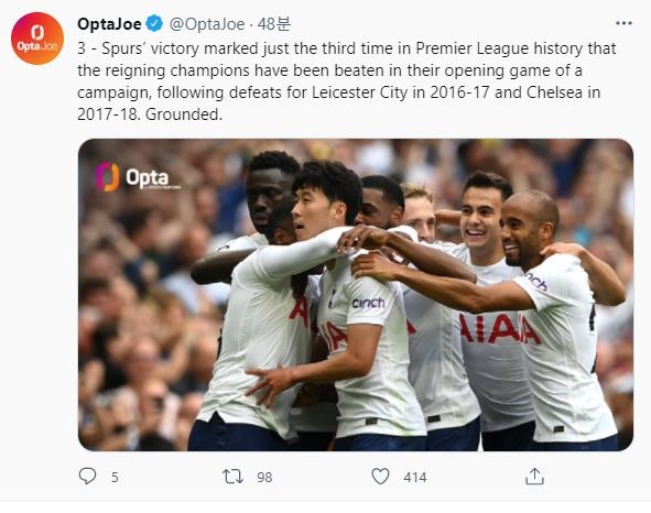 | ▲ EPL 역대 세 번째로 디펜딩 챔피언을 이긴 토트넘 [옵타조 트위터 캡처. 재판매 및 DB 금지] |