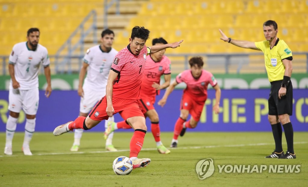 | ▲ Son Heung-min of South Korea takes a penalty against Iraq during the teams' Group A match in the final Asian qualifying round for the 2022 FIFA World Cup at Thani bin Jassim Stadium in Doha on Nov. 16, 2021. (Yonhap) |