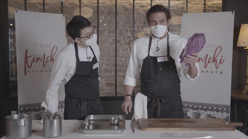 | ▲ 보랏빛 배추를 들고 있는 장미셸 카레트 셰프 프랑스에서 미슐랭 가이드 별 1개 등급을 받은 레스토랑 '오 테라스'를 운영하는 장미셸 카레트(42·오른쪽) 셰프와 '르 파스 탕'을 운영하는 이영훈(36) 셰프가 지난 21일(현지시간) 김치 담그는 과정을 촬영하고 있는 모습. [G3C 제공=연합뉴스. DB 및 재판매 금지] |