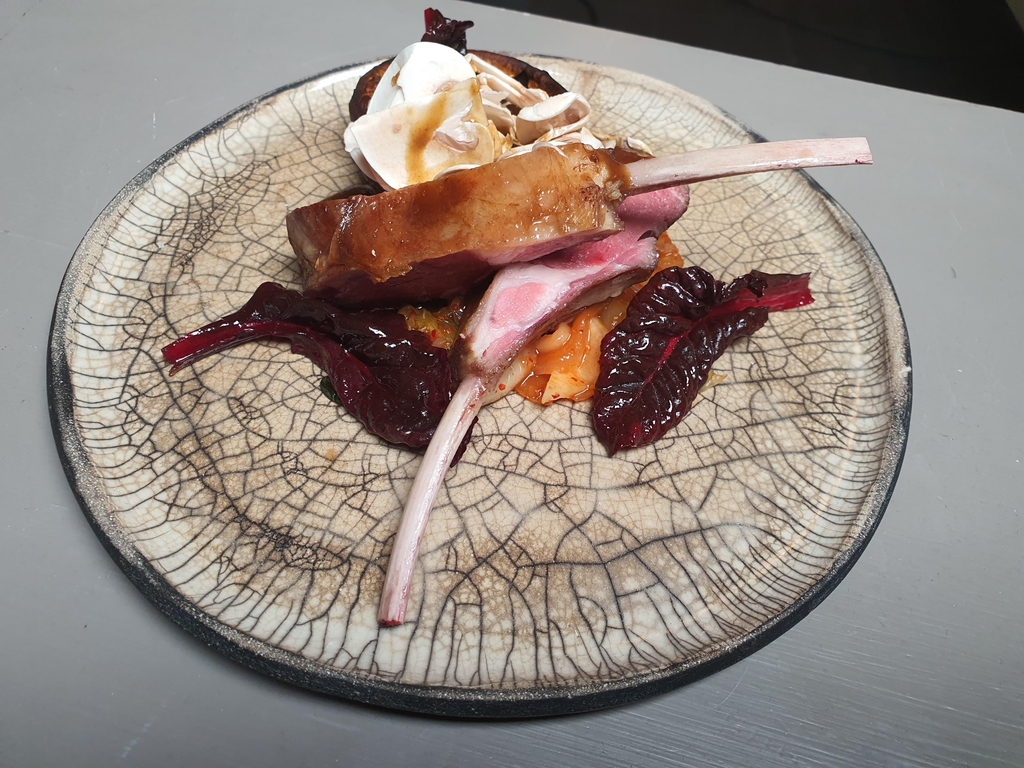 | ▲ 양고기와 함께 플레이팅한 김치 (투르뉘[프랑스]=연합뉴스) 현혜란 특파원 = 프랑스에서 미슐랭 가이드 별 1개 등급을 받은 레스토랑 '오 테라스'를 운영하는 장미셸 카레트 셰프가 지난 21일(현지시간) 김치를 곁들인 양고기 요리를 선보였다. [DB 및 재판매 금지] |
