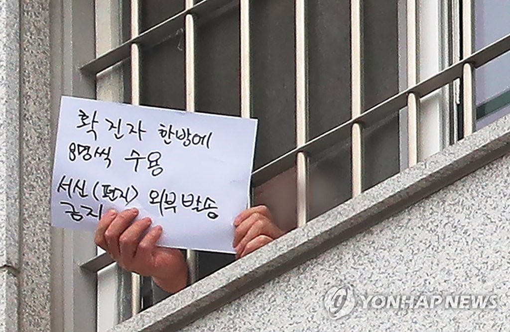 | ▲ An inmate holds up a message through a window at Dongbu Detention Center in Seoul on Dec. 29, 2020. In the message, the inmate complains that eight COVID-19 patients are confined to a cell. (Yonhap) |