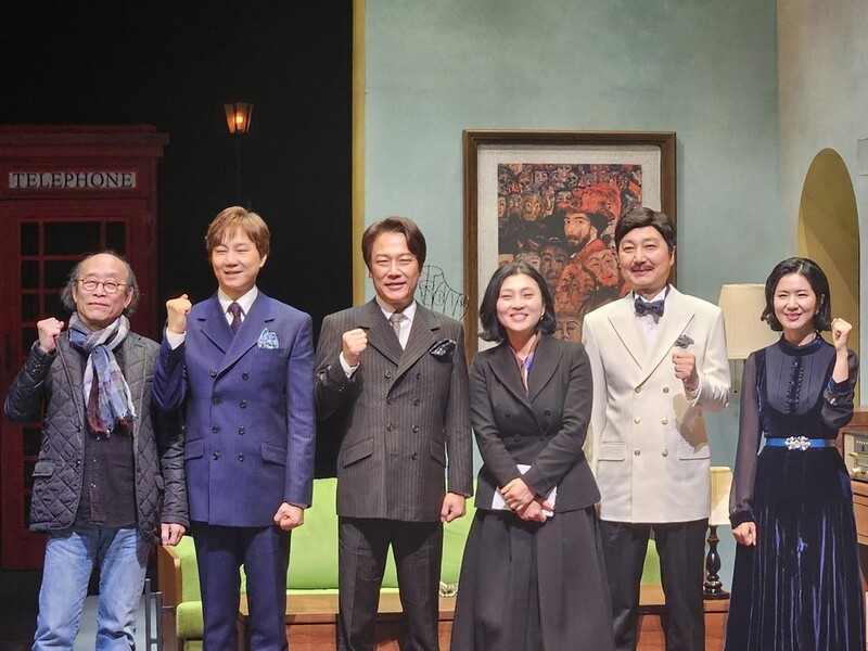 | ▲ 포즈 취하는 연극 '컬렉션' 출연진들 (서울=연합뉴스) 최주성 기자 = 1일 오후 서울 세종문화회관 S씨어터에서 열린 서울시극단 연극 '컬렉션' 프레스콜에서 김철리 드라마투르기(왼쪽부터), 배우 정원조, 강신구, 변유정 연출, 배우 김신기, 최나라가 포즈를 취하고 있다. 2023.12.1 cjs@yna.co.kr |