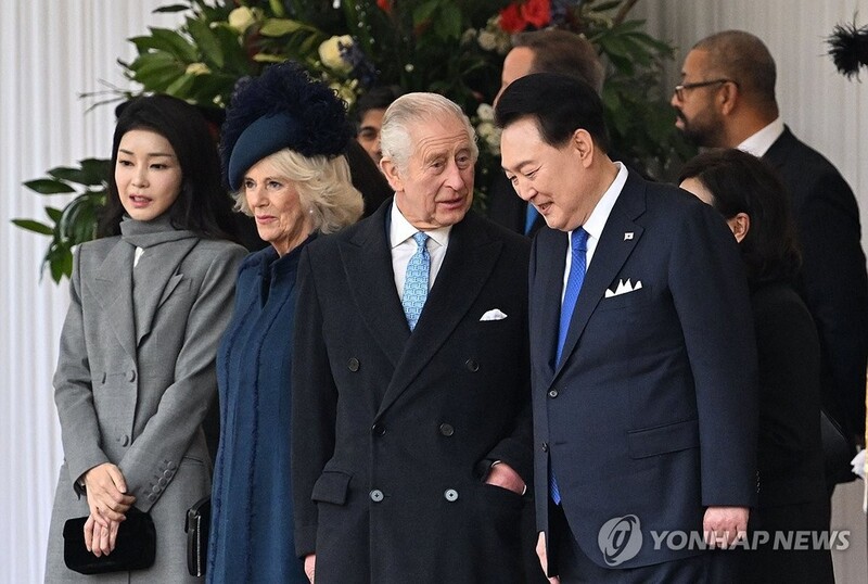 | ▲ 찰스 3세 국왕과 대화하는 윤석열 대통령 (런던=연합뉴스) 진성철 기자 = 영국을 국빈 방문한 윤석열 대통령이 21일(현지시간) 런던 호스가즈 광장에서 열린 공식환영식에서 찰스 3세 영국 국왕과 대화하고 있다. 2023.11.21 zjin@yna.co.kr |