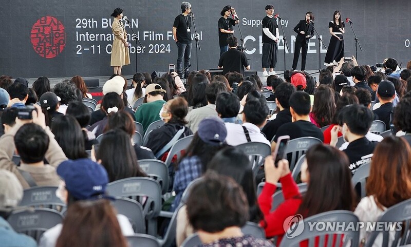 | ▲ 관객들과 함께하는 부산국제영화제 야외무대인사 (부산=연합뉴스) 진연수 기자 = 5일 오후 부산 해운대구 영화의 전당에서 열린 제29회 부산국제영화제(BIFF) 야외 무대인사에서 영화 '더 킬러스' 감독 및 배우들이 관객들과 시간을 보내고 있다. 2024.10.5 jin90@yna.co.kr |