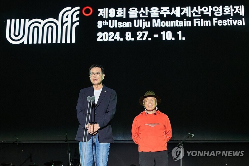 | ▲ "울산울주세계산악영화제 폐막합니다" (울산=연합뉴스) 1일 오후 울산시 울주군 영남알프스 복합웰컴센터에서 열린 '제9회 울산울주세계산악영화제' 폐막식에서 영화제 이사장인 이순걸 울주군수와 엄홍길 집행위원장이 인사말을 하고 있다. 2024.10.1 [울산울주세계산악영화제 제공. 재판매 및 DB 금지] yongtae@yna.co.kr |