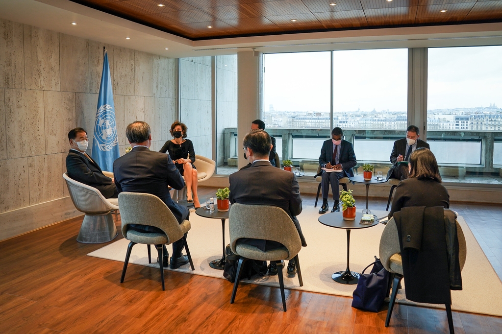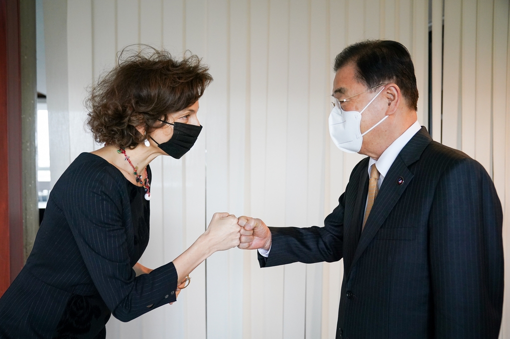 프랑스 외교부가 주최하는 '인도·태평양 협력에 관한 장관회의' 참석차 파리를 찾은 정 장관은 이날 오후 유네스코 본부에서 오드레 아줄레 유네스코 사무총장을 40여분간 면담했다.