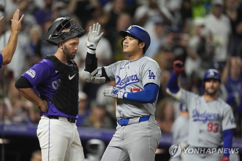 | ▲ Dodgers Rockies Baseball (덴버 AP=연합뉴스) 오타니가 28일(한국시간) 미국 콜로라도주 덴버의 쿠어스필드에서 열린 콜로라도 로키스와의 MLB 방문 경기, 6회 홈런을 친 뒤 홈플레이트를 밟고 있다. |