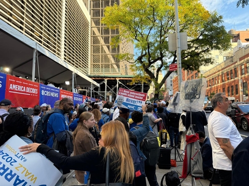 | ▲ 뉴욕 CBS 방송센터 인근 민주당 지지자들 (뉴욕=연합뉴스) 이지헌 특파원 = 1일 오후 9시(현지시간) 미국 민주당 부통령 후보인 팀 월즈 미네소타 주지사와 공화당 부통령 후보인 J.D. 밴스 상원의원(오하이오)의 TV 토론이 열리는 뉴욕시 CBS 방송센터 인근에서 민주당 지지자들이 월즈 후보 지지를 외치고 있다. 2024.10.1 pan@yna.co.kr |