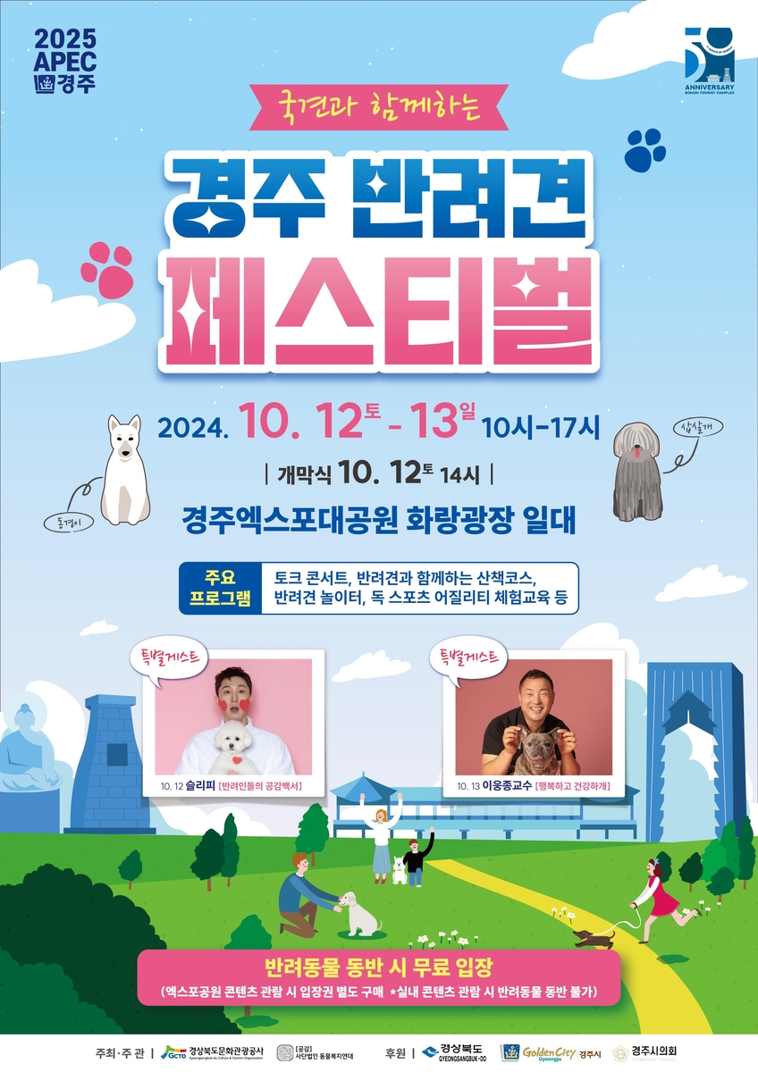 또 경북문화관광공사와 동물복지연대 공감은 12일부터 13일까지 경주엑스포대공원 화랑광장에서 '경주 반려견 페스티벌'을 개최한다.