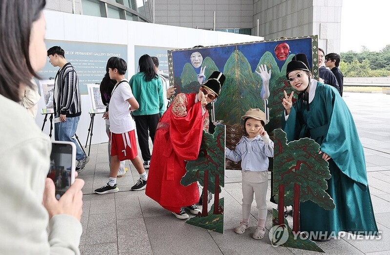 | ▲ '일월오봉도와 함께 찰칵' (서울=연합뉴스) 이재희 기자 = 6일 오후 서울 용산구 국립중앙박물관에서 열린 전시품 분장놀이 축제 '국중박이 살아있다'에서 한 어린이가 '일월오봉도'를 코스프레한 참가자와 기념 촬영을 하고 있다. 2024.10.6 scape@yna.co.kr |