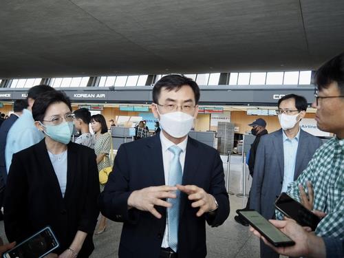| ▲ Deputy Trade Minister Ahn Sung-il (C) speaks to reporters at Washington Dulles International Airport on Aug. 31, 2022 before heading home after a three-day visit to the U.S. (Yonhap) |
