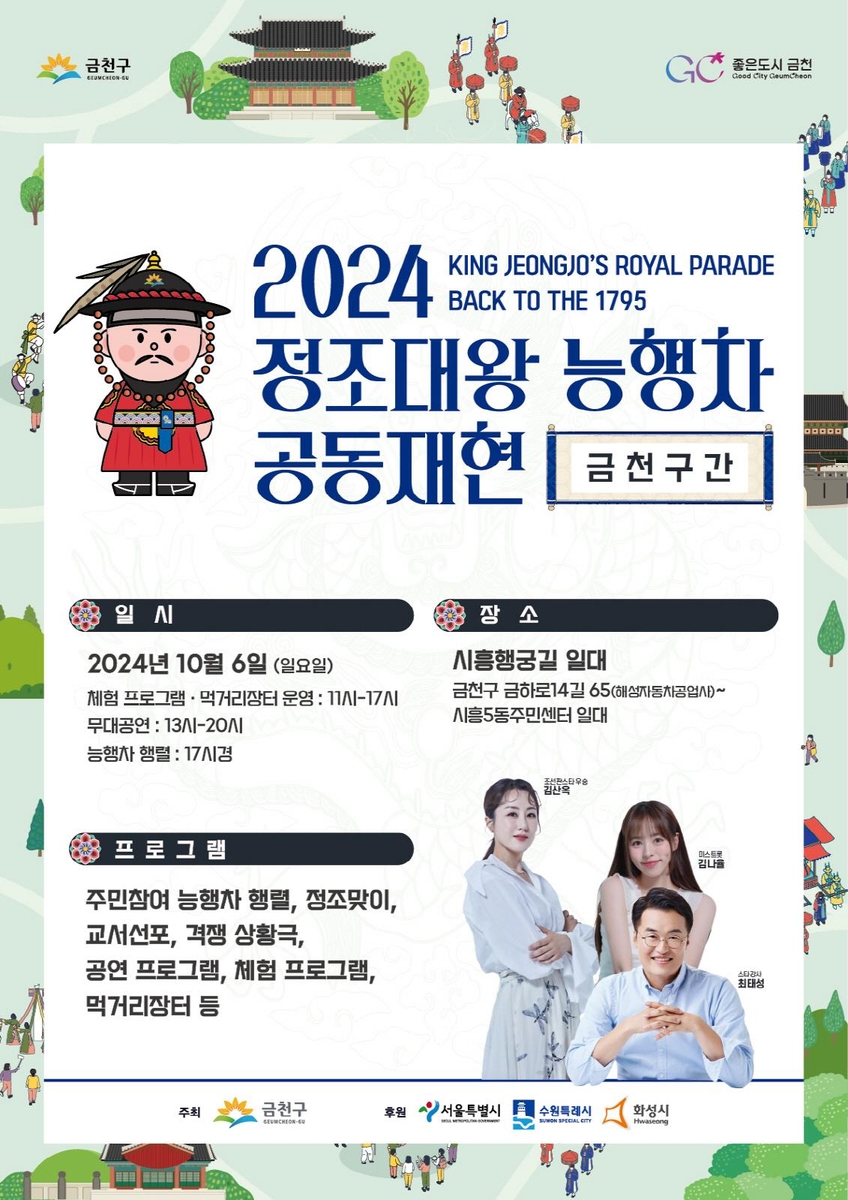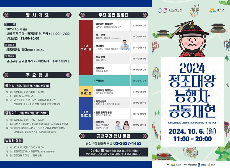 (서울=연합뉴스) 정준영 기자 = 서울 금천구(구청장 유성훈)는 오는 6일 오전 11시부터 오후 8시까지 시흥대로와 시흥행궁터 일대에서 '제7회 정조대왕 능행차 공동 재현행사'를 개최한다고 2일 밝혔다.