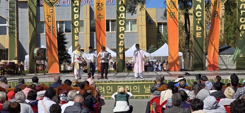 지역에 살고 있는 고려인들이 한자리에 모인 가운데 충북 청주 산오락회와 강원 원주 또랑광대가 '연해주 길마중' 공연을 무대에 올렸다.