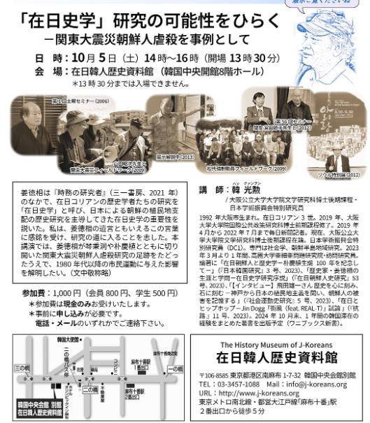 도쿄 미나토구 소재 한국중앙회관 대강당에서 열리는 세미나에서는 오사카공립대 교수인 한광훈 일본학술진흥회 특별연구원이 '재일사학 연구의 가능성을 넓힌다'를 주제로발표한 뒤 학계 관계자들과 토론을 이어간다.