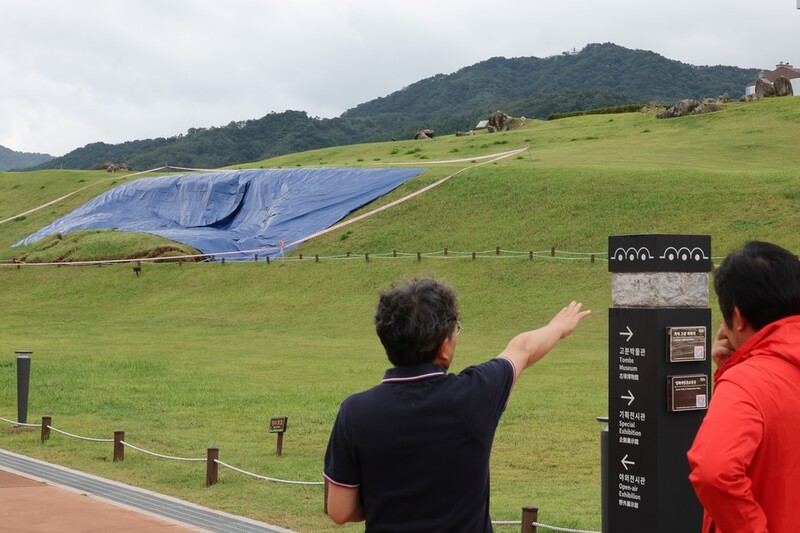 | ▲ 물폭탄에 일부 붕괴한 세계유산 가야고분군 (김해=연합뉴스) 최병길 기자 = 지난 21일 내린 폭우로 붕괴한 유네스코 세계유산인 경남 김해시 대성동고분군에서 22일 시 관계자가 현장을 설명하고 있다. 2024.9.22 choi21@yna.co.kr |