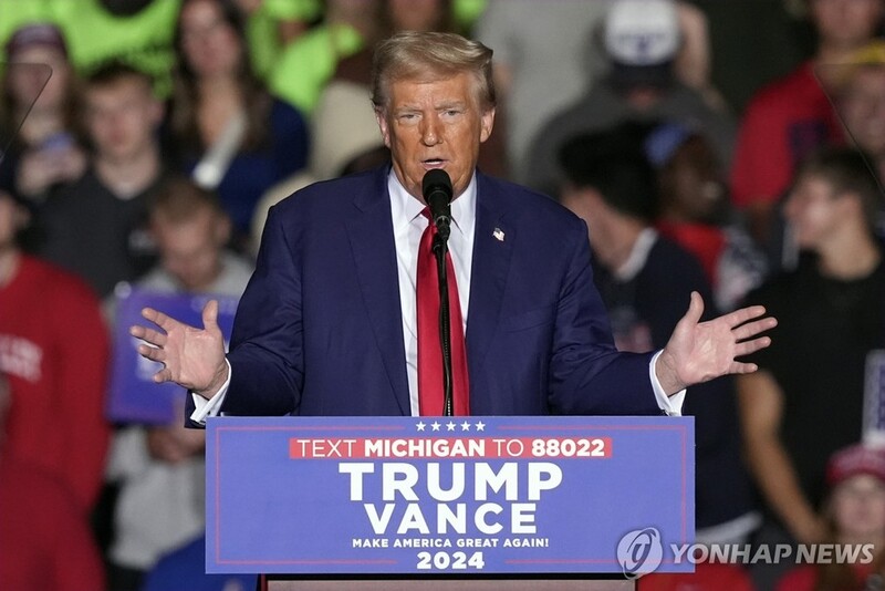 ▲ Former President Donald Trump speaks at a campaign event at the Ryder Center at Saginaw Valley State University in University Center, Michigan, on Oct. 3, 2024, in this photo released by the Associated Press. (Yonhap)