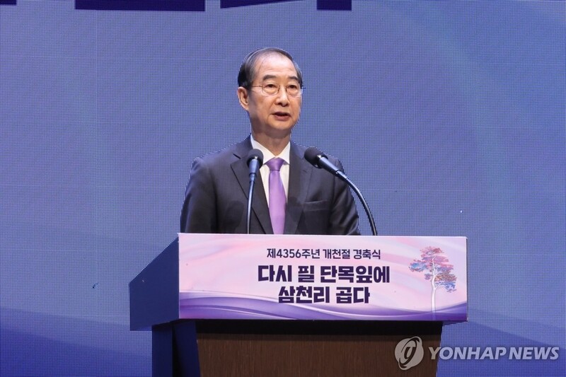 | ▲ Prime Minister Han Duck-soo delivers a speech at a ceremony commemorating National Foundation Day on Oct. 3, 2024. (Yonhap) |