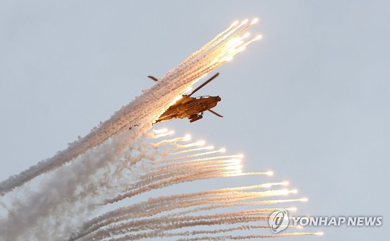 | ▲ An Apache attack helicopter fires flares as it takes part in the Armed Forces Day ceremony at Seoul Air Base in Seongnam, just south of Seoul, on Oct. 1 , 2024. (Yonhap) |
