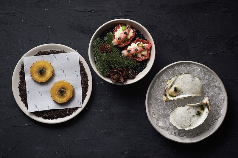 라브리는 완도산 전복과 제주산 광어를 비롯해 감태, 꼬시래기, 우엉, 무, 흑마늘 등 한국에서 공수해 온 식재료를 활용해 색다른 맛과 경험을 제공한다.