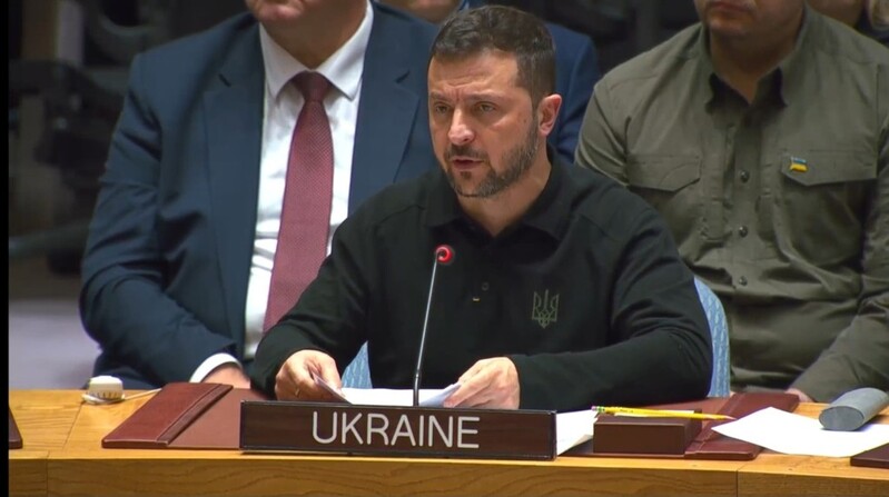 | ▲ Ukrainian President Volodymyr Zelenskyy speaks during a U.N. Security Council meeting on Ukraine at the U.N. headquarters in New York on Sept. 24, 2024, in this photo captured from U.N. Web TV. (PHOTO NOT FOR SALE) (Yonhap) |