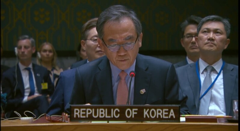 | ▲ South Korean Foreign Minister Cho Tae-yul speaks during a U.N. Security Council meeting on Ukraine at the U.N. headquarters in New York on Sept. 24, 2024, in this photo captured from U.N. Web TV. (PHOTO NOT FOR SALE) (Yonhap) |