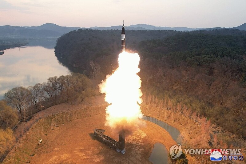 | ▲ A Hwasongpho-16B, a new type of intermediate-range solid-fuel ballistic missile equipped with a newly developed hypersonic gliding warhead, is launched on April 2, 2024, in this file photo released by the North's official Korean Central News Agency the following day. (For Use Only in the Republic of Korea. No Redistribution) (Yonhap) |