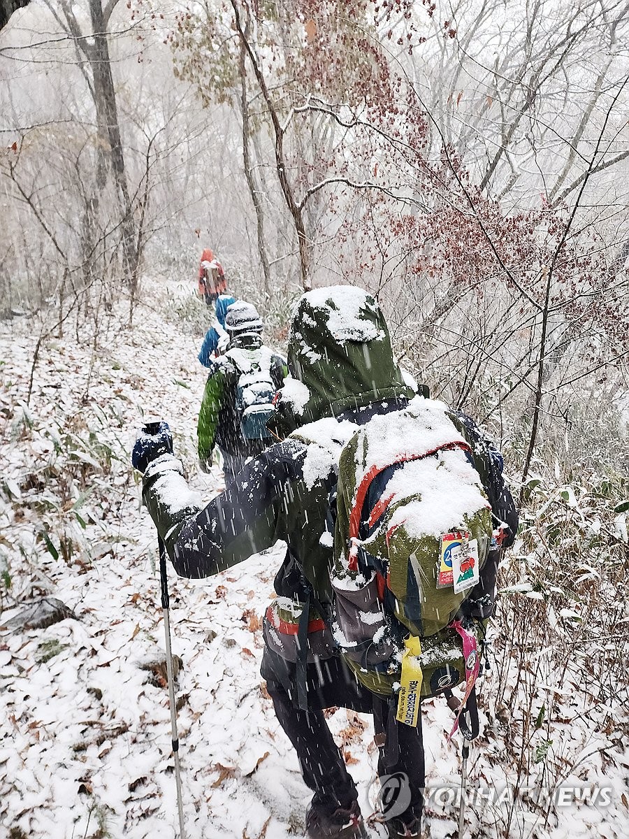 | ▲ 눈 내린 광주 무등산 (광주=연합뉴스) 17일 오후 광주 무등산 장불재에서 전남 화순군으로 향하는 등산로에서 시민들이 걷고 있다. 2023.11.17 [독자 제공. 재판매 및 DB 금지] daum@yna.co.kr |