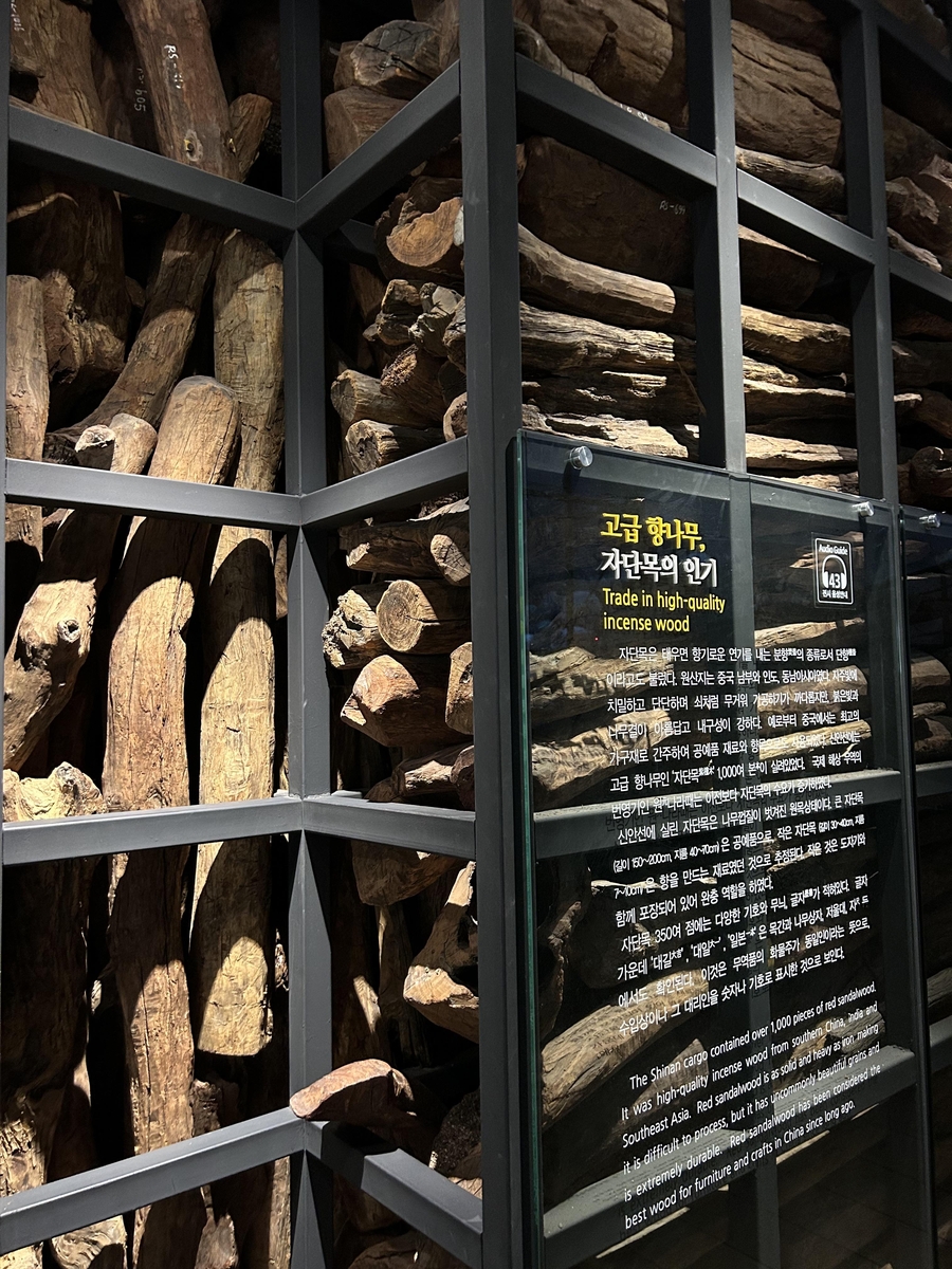 | ▲ 신안선에서 나온 자단목 (목포=연합뉴스) 김예나 기자 = 전남 목포의 국립해양문화재연구소 목포해양유물전시관에 전시된 자단목 모습. 자단목은 태우면 향기로운 연기를 내는 나무로, 신안선에는 자단목 1천여 점이 실려있었던 것으로 확인된다. 2023.11.17 yes@yna.co.kr |