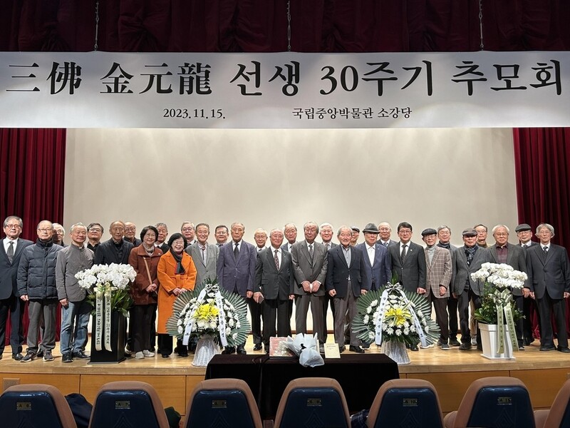 | ▲ 삼불 김원용 선생 3주기 추모회 (서울=연합뉴스) 김예나 기자 = 15일 서울 용산구 국립중앙박물관 소강당에서 열린 삼불(三佛) 김원용(1922∼1993) 선생 30주기 추모회에서 고고학, 미술사학 등 문화 예술 분야 주요 관계자들이 기념사진을 촬영하고 있다. 2023.11.15 yes@yna.co.kr |