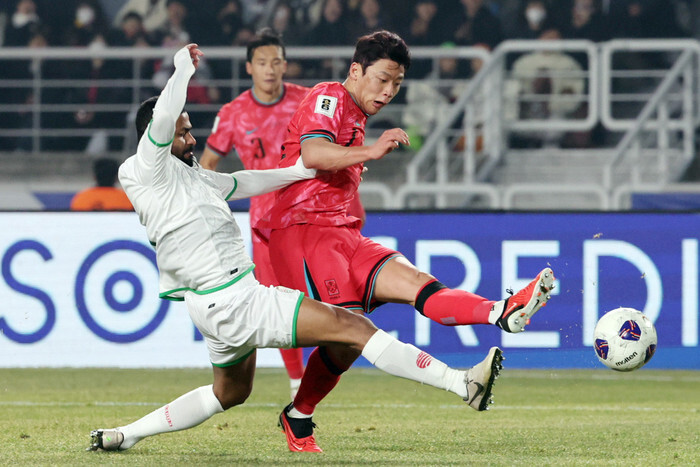 Hwang Hee-chan (R) of South Korea scores the opening goal during the first half of a Group B football match against Oman at Goyang Stadium in Goyang, northwest of Seoul, on March 20, 2025, in the third round of Asian qualifying for the 2026 World Cup. (Yonhap)