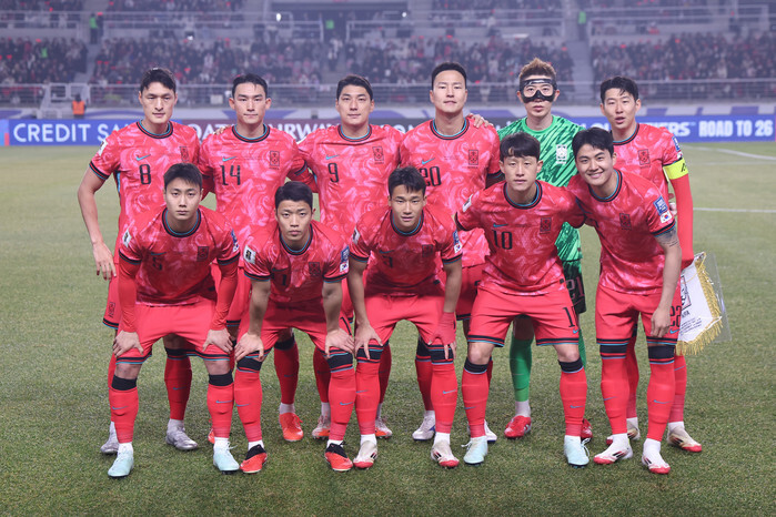 South Korea's starting XI pose for a team photo ahead of a Group B football match against Oman at Goyang Stadium in Goyang, northwest of Seoul, on March 20, 2025, in the third round of Asian qualifying for the 2026 World Cup. (Yonhap)
