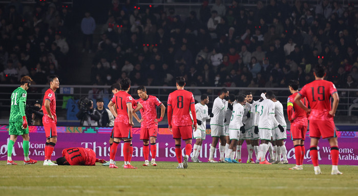 South Korean players react after Oman equalized with a goal from Ali Al-Busaidi during the second half of a Group B football match at Goyang Stadium in Goyang, northwest of Seoul, on March 20, 2025, in the third round of Asian qualifying for the 2026 World Cup. The match ended in a 1-1 draw. (Yonhap)
