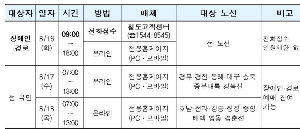예매 대상은 오는 9월 8∼12일 운행하는 KTX·ITX-새마을·무궁화호 열차 등이다.