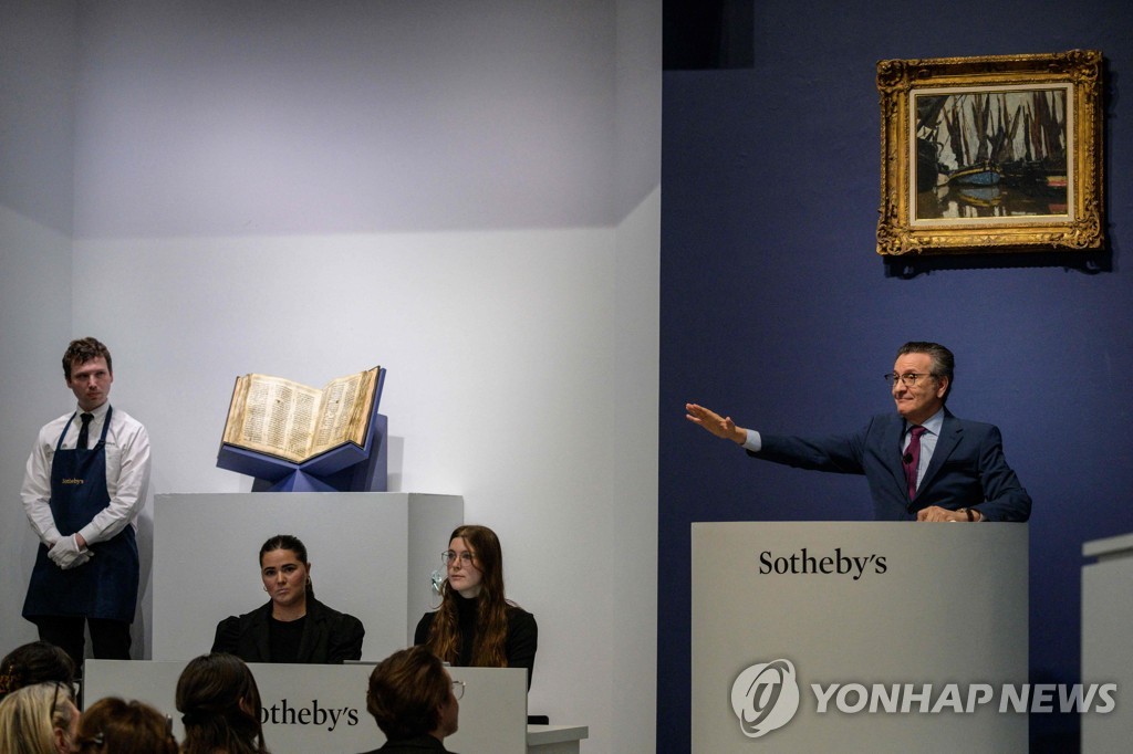 | ▲ 코덱스 사순의 입찰을 진행하는 소더비 (뉴욕 AFP=연합뉴스) 소더비 경매에서 코덱스 사순의 입찰이 진행되고 있다. 2023.5.17 photo@yna.co.kr |
