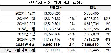 다른 OTT의 6월 DAU 평균은 웨이브가 110만명, 쿠팡플레이가 80만6천명으로 각각 작년 12월보다 2%, 9% 감소했다. 디즈니+는 작년 12월에 하루 평균 42만2천명이 이용했으나 올해 6월에는 30만8천명에 그쳐 27% 줄었다.