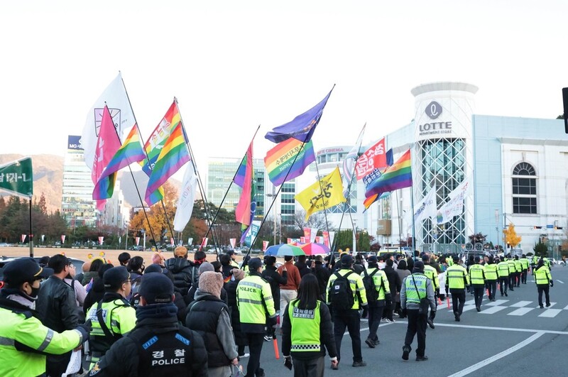 | ▲ '성소수자 모여라'…경남퀴어문화축제 거리 행진 (창원=연합뉴스) 정종호 기자 = 25일 경남 창원시 성산구 롯데마트맥스 옆 중앙대로에서 열린 제3회 경남퀴어문화축제 참가자들이 창원광장 인근에서 거리 행진을 벌이고 있다. 2023.11.25 jjh23@yna.co.kr |