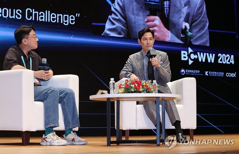 | ▲ 국제방송영상마켓 행사 참석한 이정재 (서울=연합뉴스) 이재희 기자 = 배우 이정재가 27일 오후 서울 강남구 코엑스에서 열린 '국제방송영상마켓 2024'(BCWW 2024)에서 김성훈 씨네21 디지털콘텐츠본부장과 대담을 나누고 있다. 2024.8.27 scape@yna.co.kr |