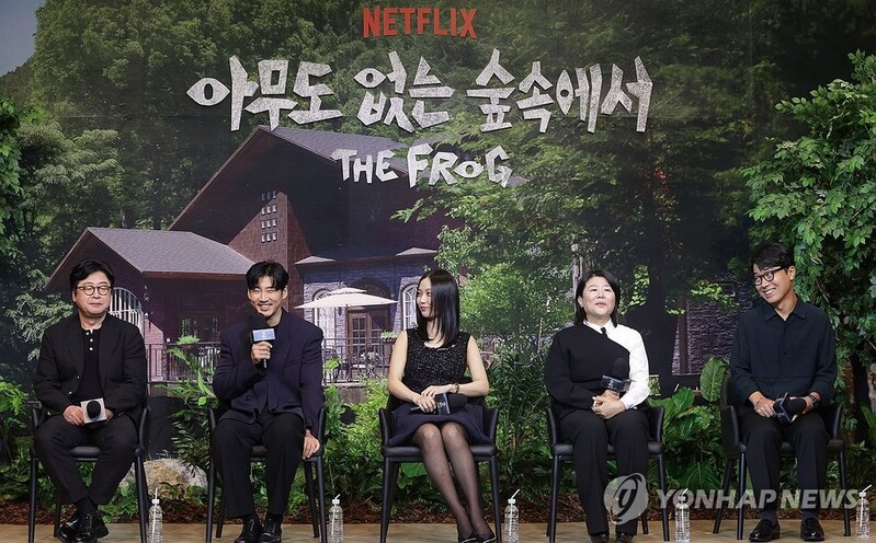 | ▲ 넷플릭스 '아무도 없는 숲속에서' 제작발표회 (서울=연합뉴스) 강민지 기자 = 21일 서울 강남구 조선팰리스 서울 강남에서 열린 넷플릭스 오리지널 시리즈 '아무도 없는 숲속에서' 제작발표회에서 주역들이 포즈를 취하고 있다. 왼쪽부터 윤계상, 이정은, 모완일 감독, 고민시, 김윤석. 2024.8.21 mjkang@yna.co.kr |