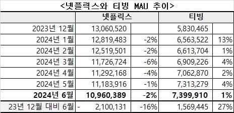 | ▲ 넷플릭스와 티빙 MAU 추이 [자료 모바일인덱스. 재판매 및 DB 금지] |