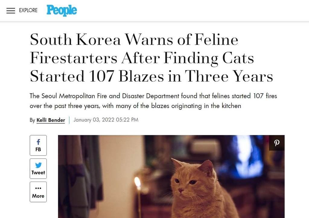 | ▲ "한국 소방당국, '고양이 방화범'에 대해 경고" ['피플' 온라인 화면 캡처. 재판매 및 DB 금지] |