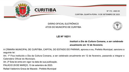 2월 12일은 한인 이민자들이 브라질에 처음 도착한 날짜로 쿠리치바시 의회는 이날을 한국문화의 날로 지정, 시의 공식 일정에 포함했다.