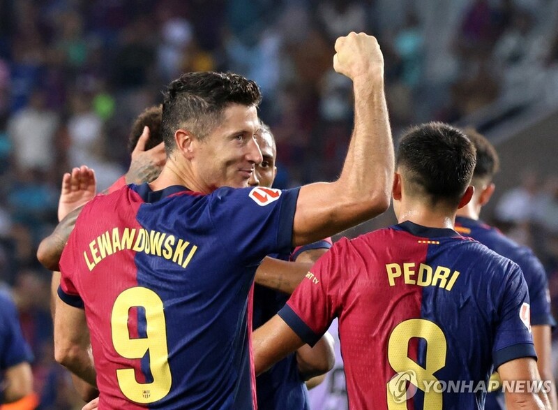 (서울=연합뉴스) 이영호 기자 = 스페인 프로축구 프리메라리가 FC바르셀로나가 두 차례 골대 불운을 이겨낸 '골잡이' 로베르트 레반도프스키(36·폴란드)의 결승골을 앞세워 개막 2연승을 내달렸다.