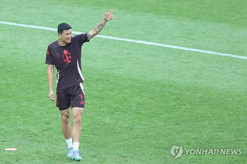 | ▲ 손 흔드는 김민재 (서울=연합뉴스) 신현우 기자 = 토트넘 홋스퍼와 2024 쿠팡플레이 시리즈를 치르는 바이에른 뮌헨 김민재가 2일 오후 서울월드컵경기장에서 훈련하며 손을 흔들고 있다. 뮌헨은 오는 3일 20시 서울월드컵경기장에서 토트넘과 쿠팡플레이 시리즈 2경기를 치른다. 2024.8.2 nowwego@yna.co.kr |