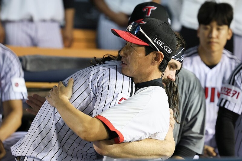 | ▲ 염경엽 감독과 포옹하는 켈리 (서울=연합뉴스) 20일 서울 잠실야구장에서 열린 2024 신한 SOL뱅크 KBO리그 두산 베어스와 LG 트윈스의 경기. LG 선발 켈리가 염경엽 감독과 포옹하고 있다. 이날 경기는 켈리의 방출 전 마지막 경기였지만 폭우로 우천 노게임이 선언됐다. 2024.7.20 [LG 트윈스 제공. 재판매 및 DB 금지] photo@yna.co.kr |