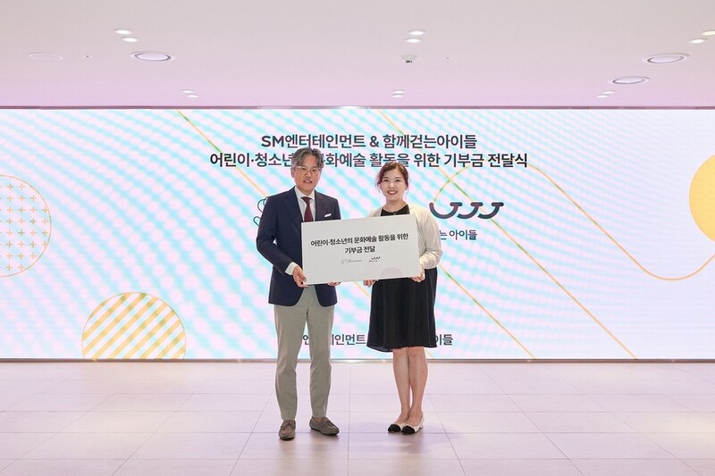 | ▲ SM엔터테인먼트, 취약계층 관악단 프로그램에 3천만원 후원 [SM엔터테인먼트 제공. 재판매 및 DB 금지] SM 장철혁 공동대표(좌)와 김현주 함께걷는아이들 국장(우). |