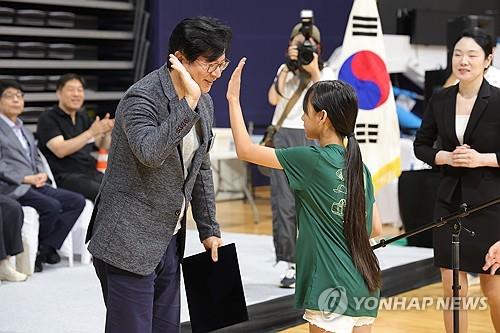 | ▲ Seong Ghi-hong (L), CEO and president of Yonhap News Agency, high-fives a participant for the 2024 National Multicultural Family Badminton Tournament at Goyang Gym in the city of Goyang, just north of Seoul, on Aug. 24, 2024 (Yonhap) |